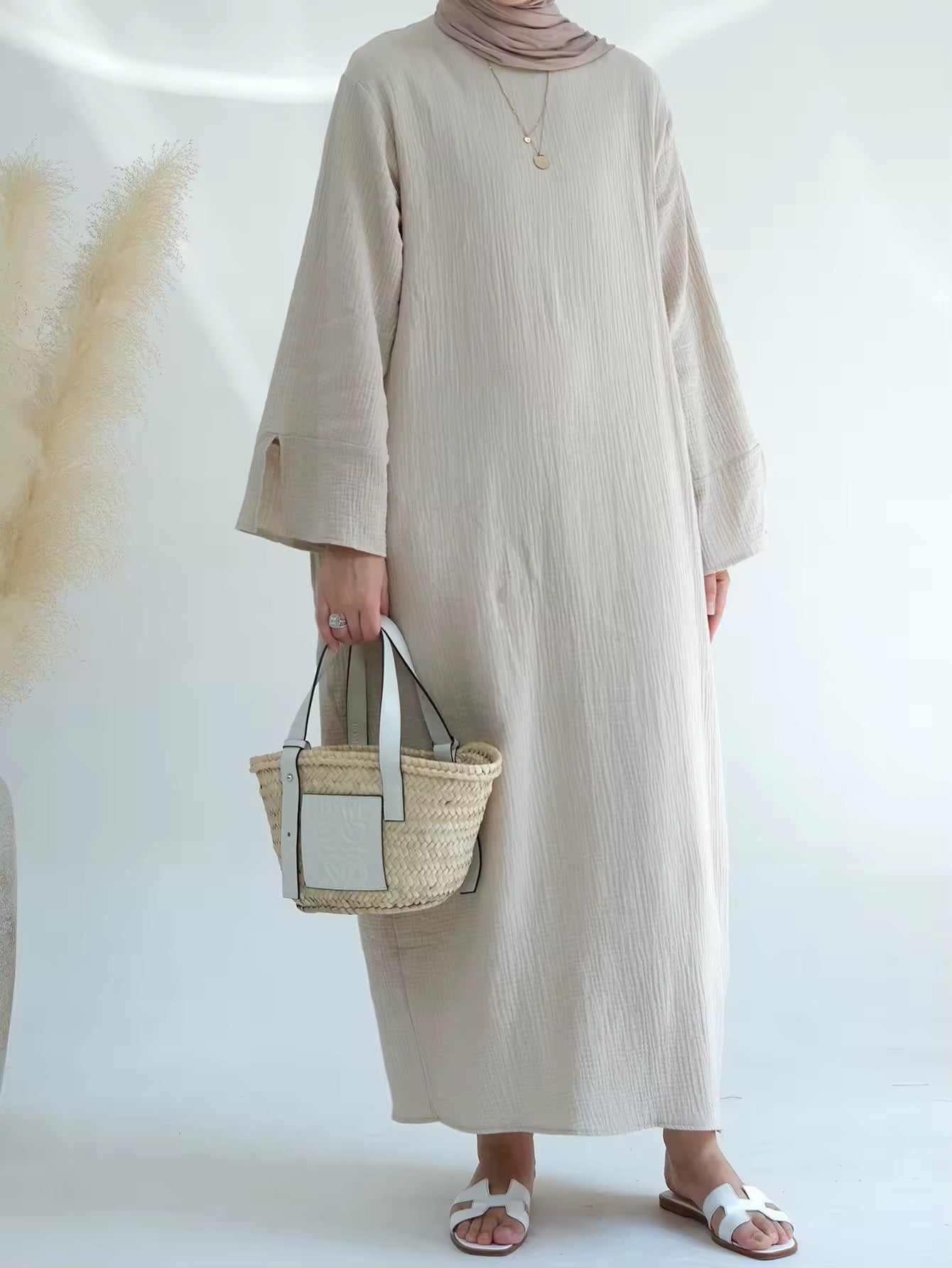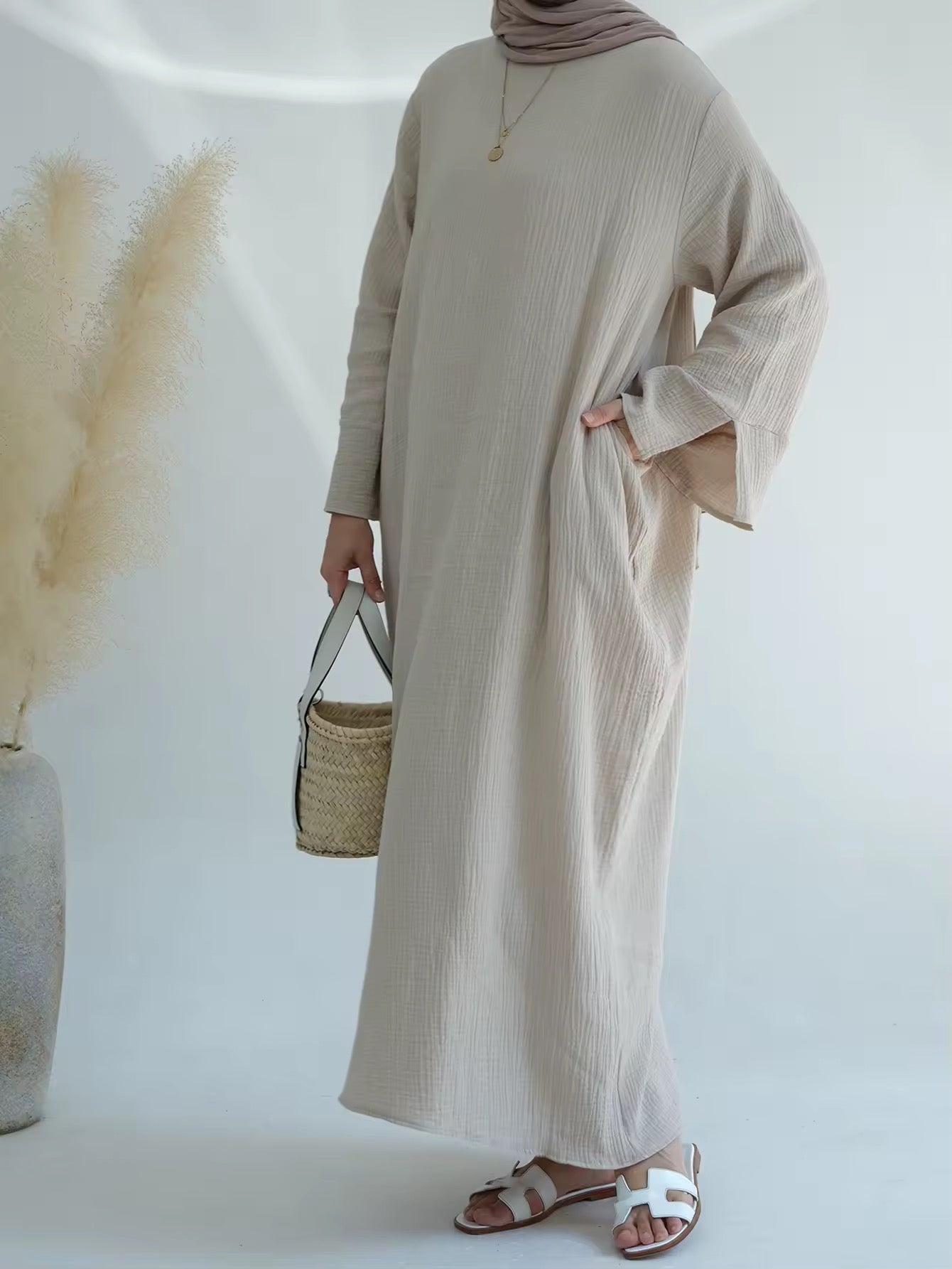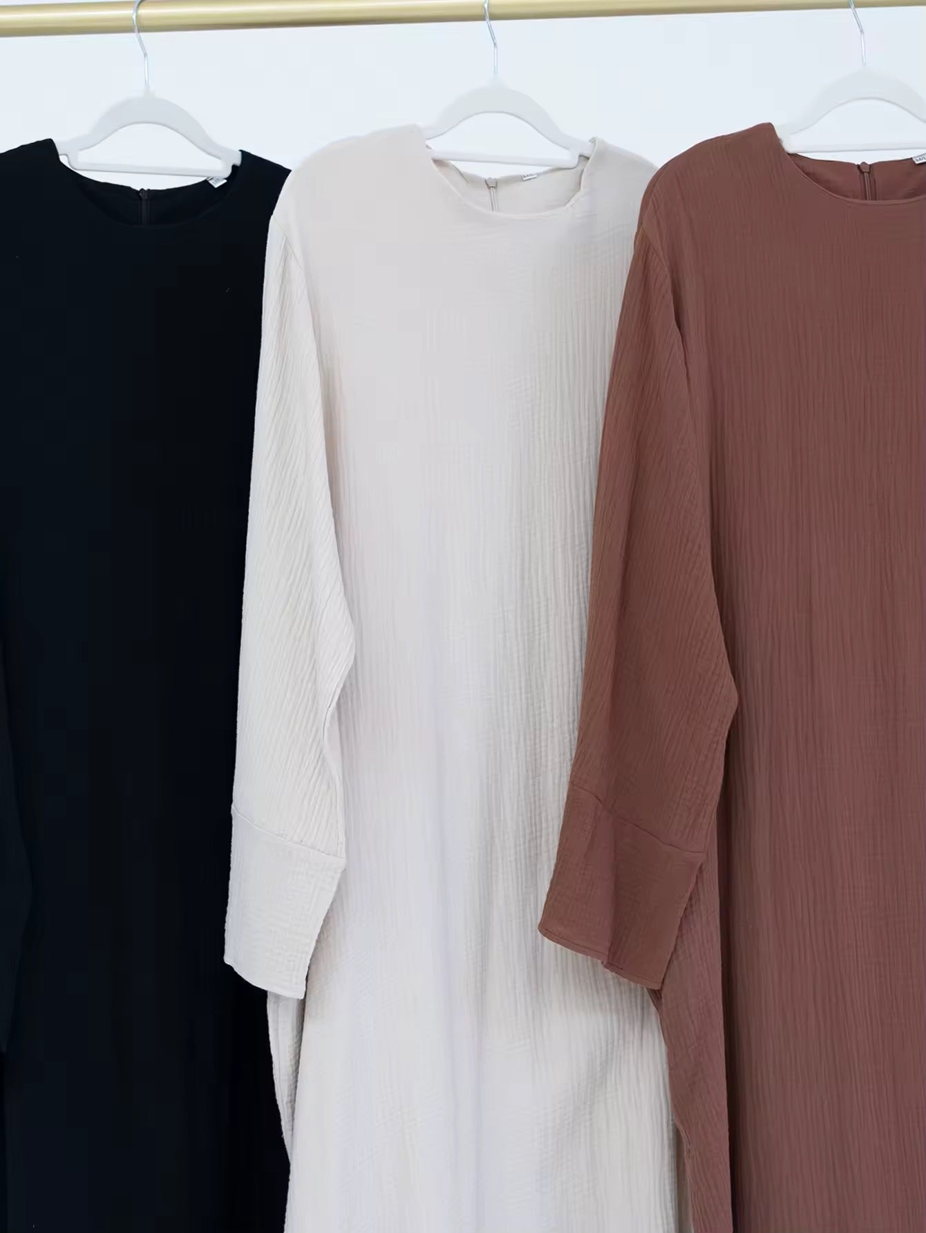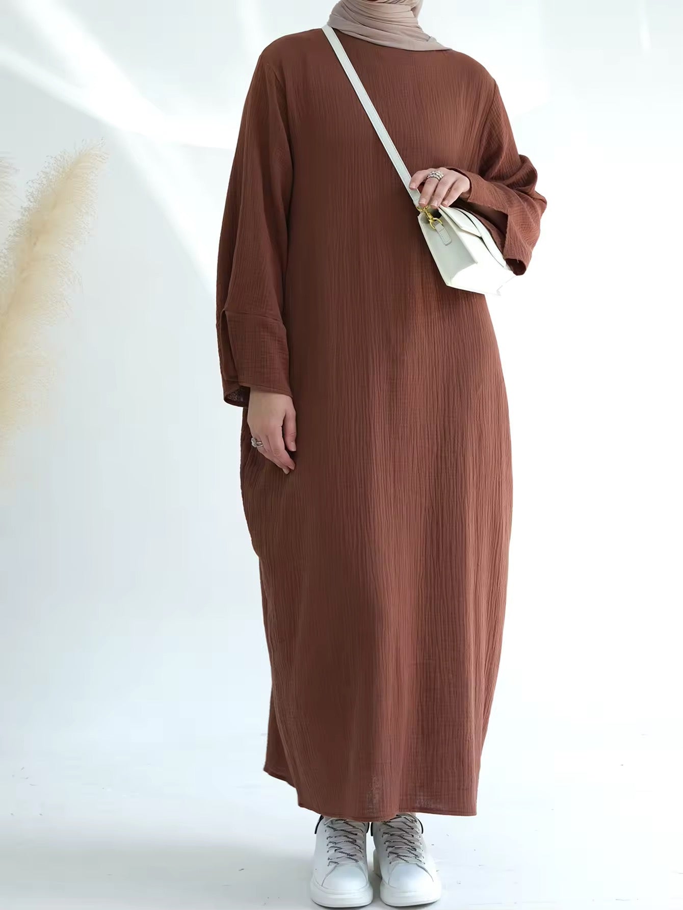 Unser luftiges Maxikleid aus hochwertigem Musselin ist die perfekte Kombination aus Stil und Bequemlichkeit. Mit seiner lockeren Passform, den eleganten weiten Ärmeln und dem minimalistischen Design ist es ideal für warme Tage, besondere Anlässe oder entspannte Alltagslooks. Das Kleid verleiht dir eine mühelose Eleganz und schmeichelt jeder Figur. Erhältlich in den Farben Schwarz, Creme und Braun.